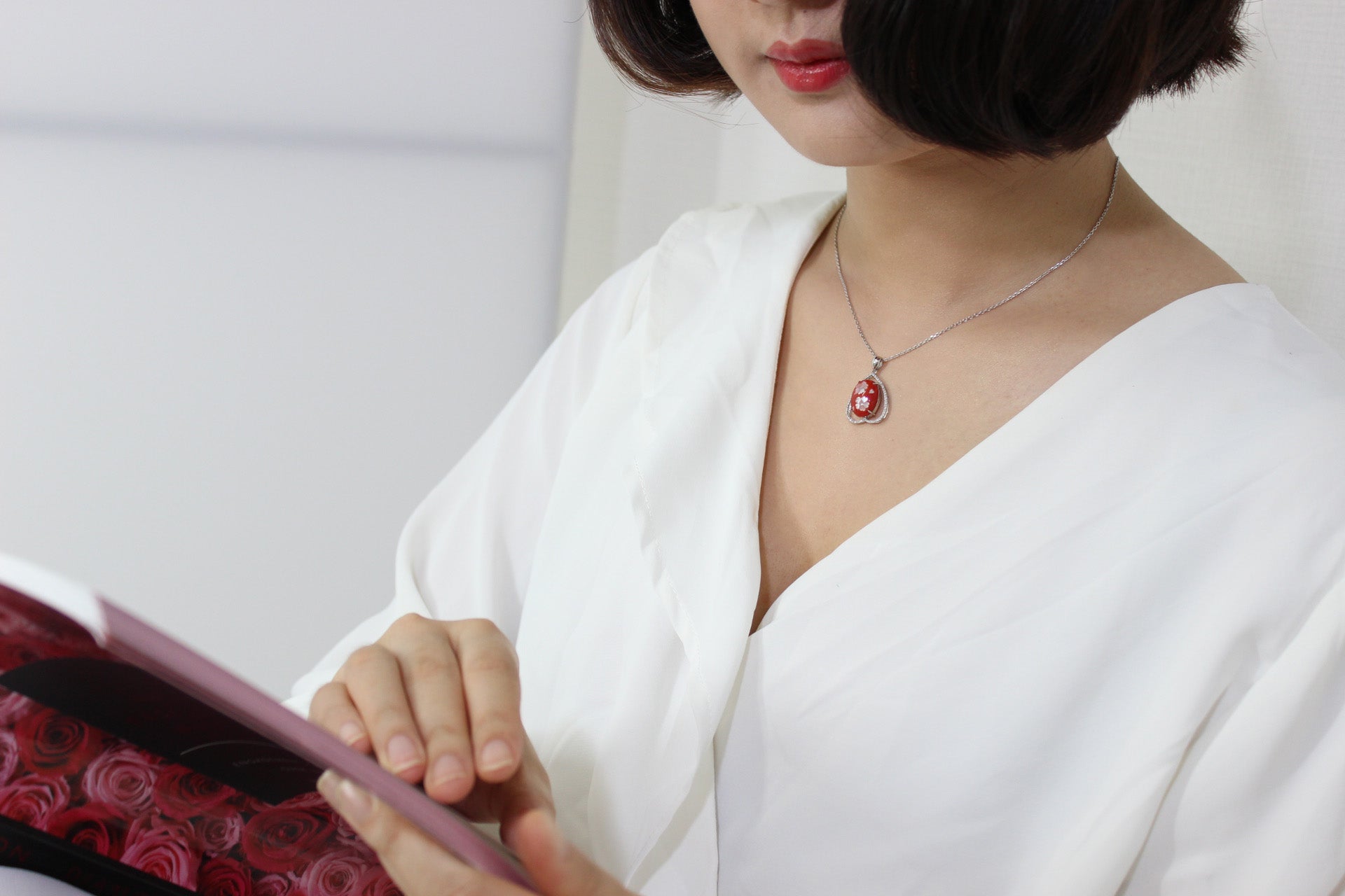 ネックレスの主役である珊瑚は、厳選された高品質な珊瑚が使用され、深みのある豊かな色合いと独特の艶を放ちます。