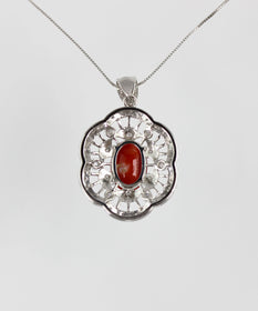 レース模様のようなデザインの中にトロリとした赤いサンゴを