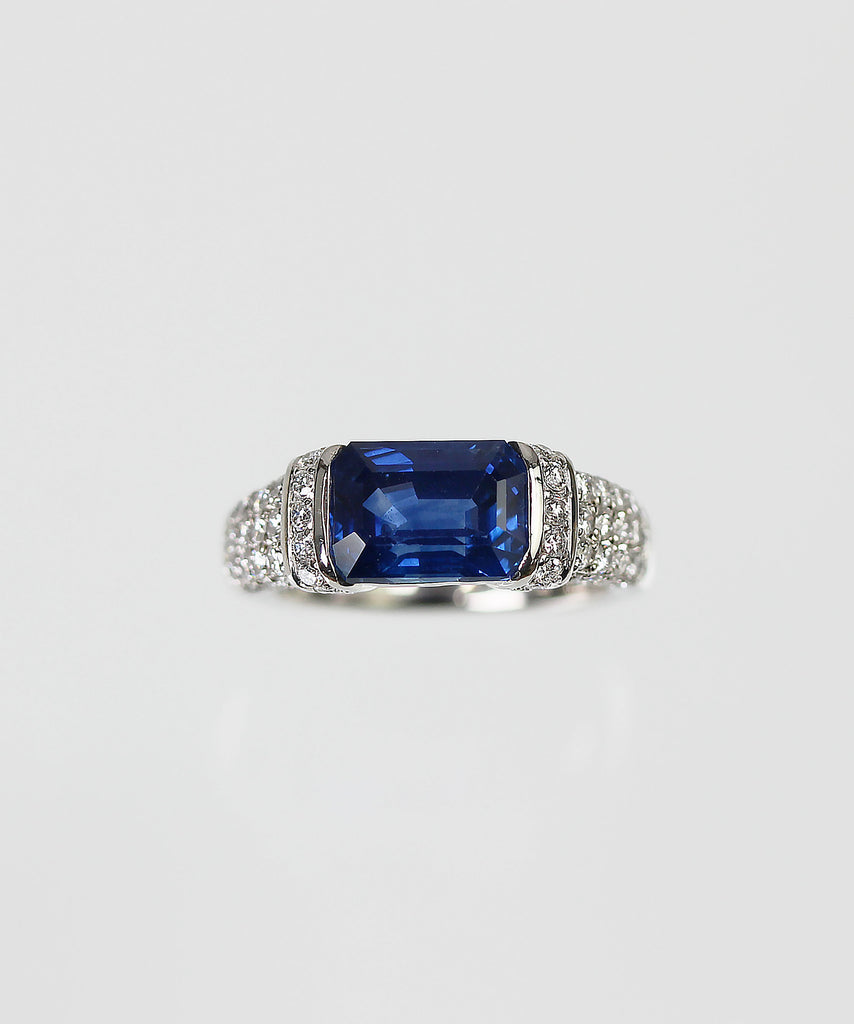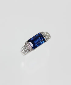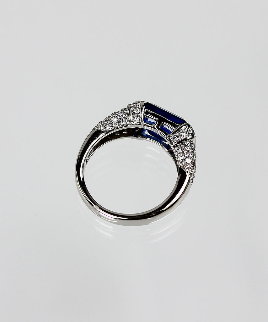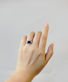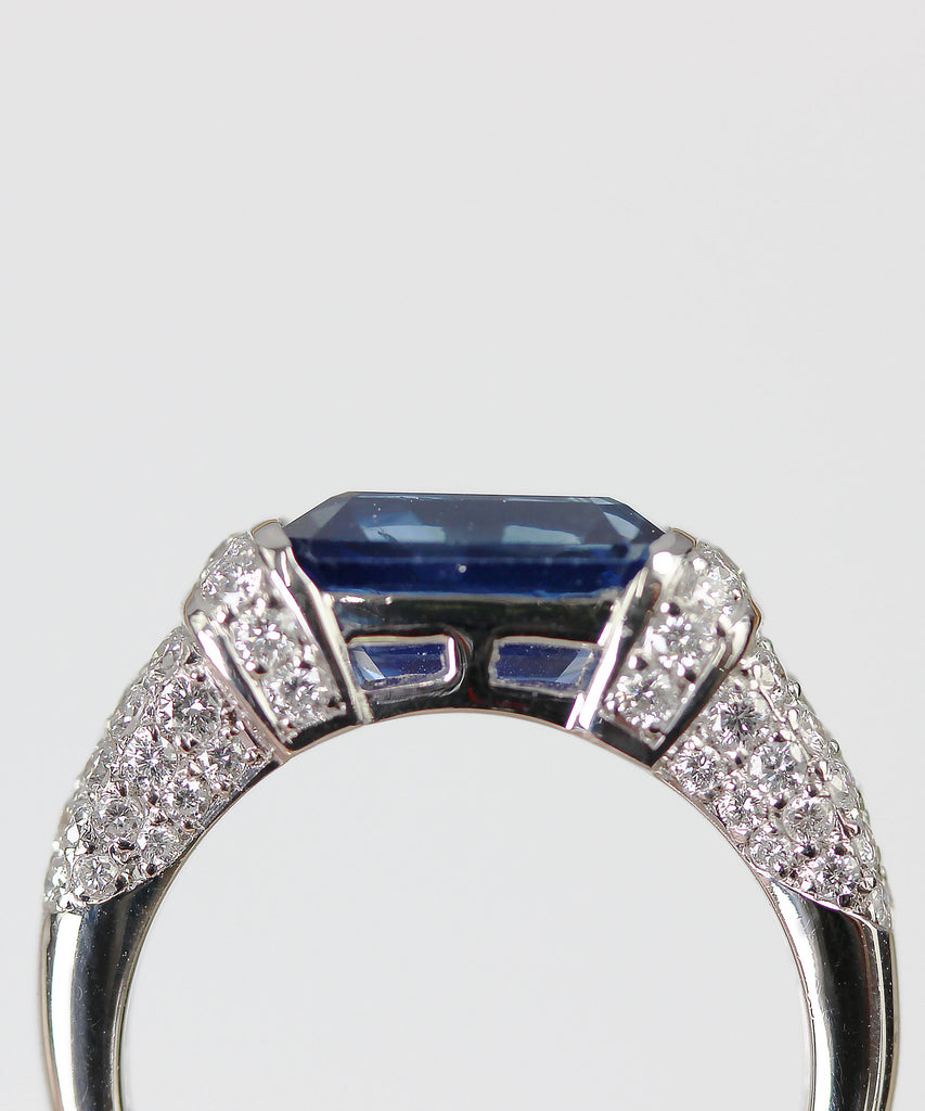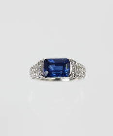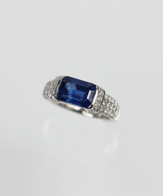 長方形のブルーサファイヤを横使いにし個性的なデザインに