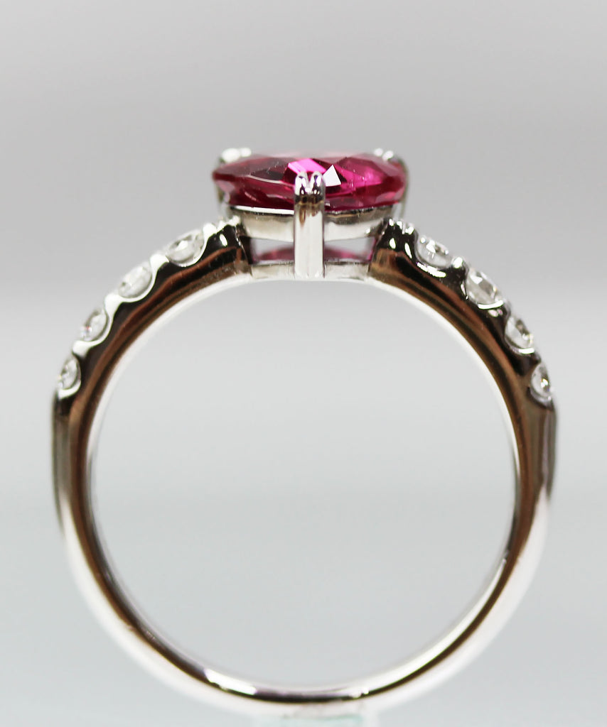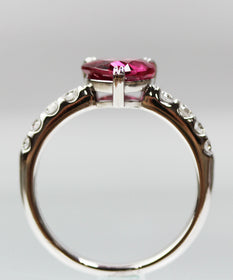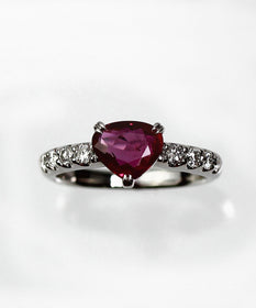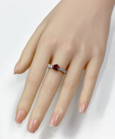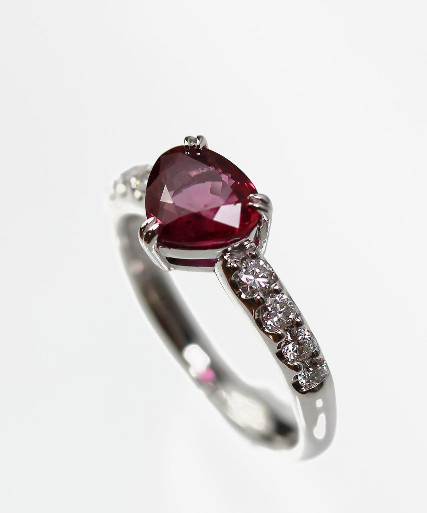 洗練された美しさと個性を兼ね備えたこのリングの中央には1.423ctのパープリッシュルビーがセットされており、その美しい色合いと輝きが際立ちます。