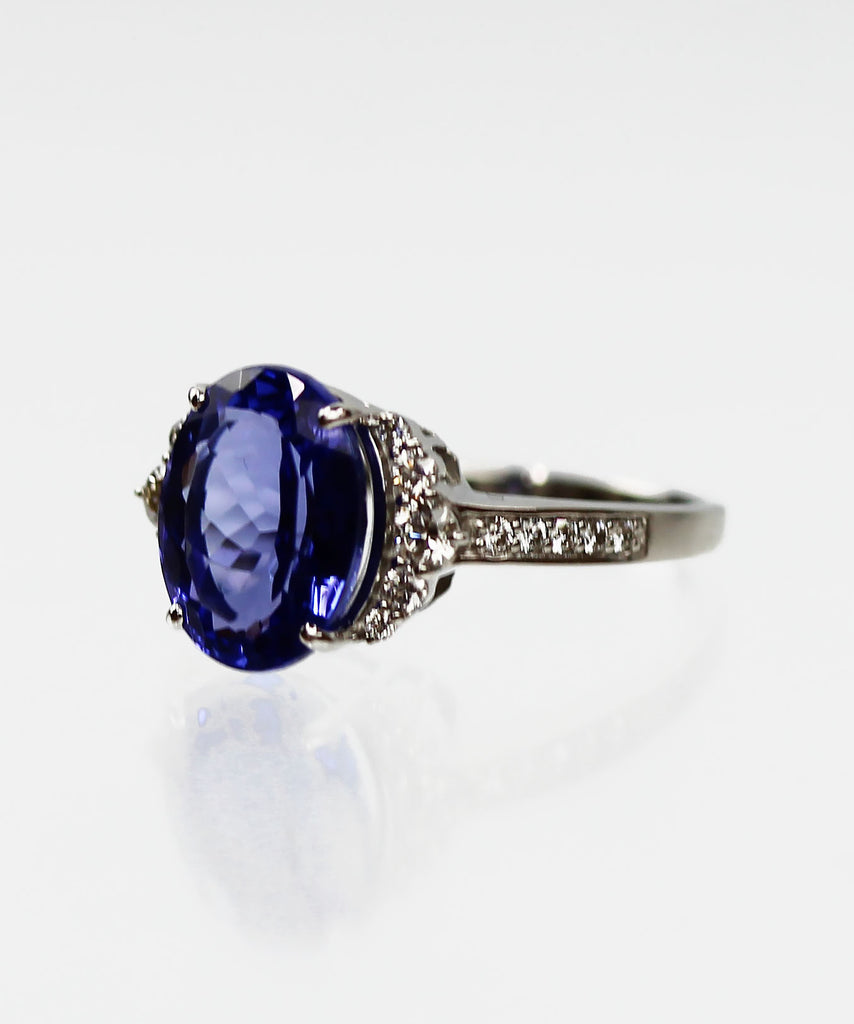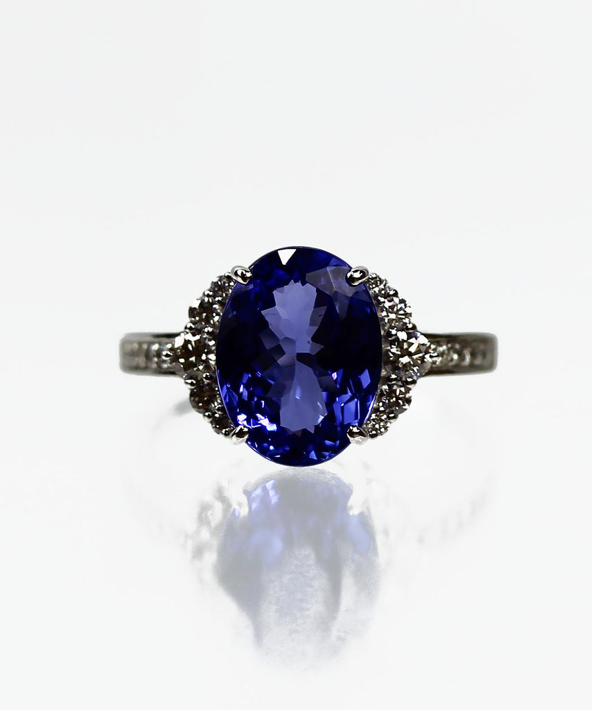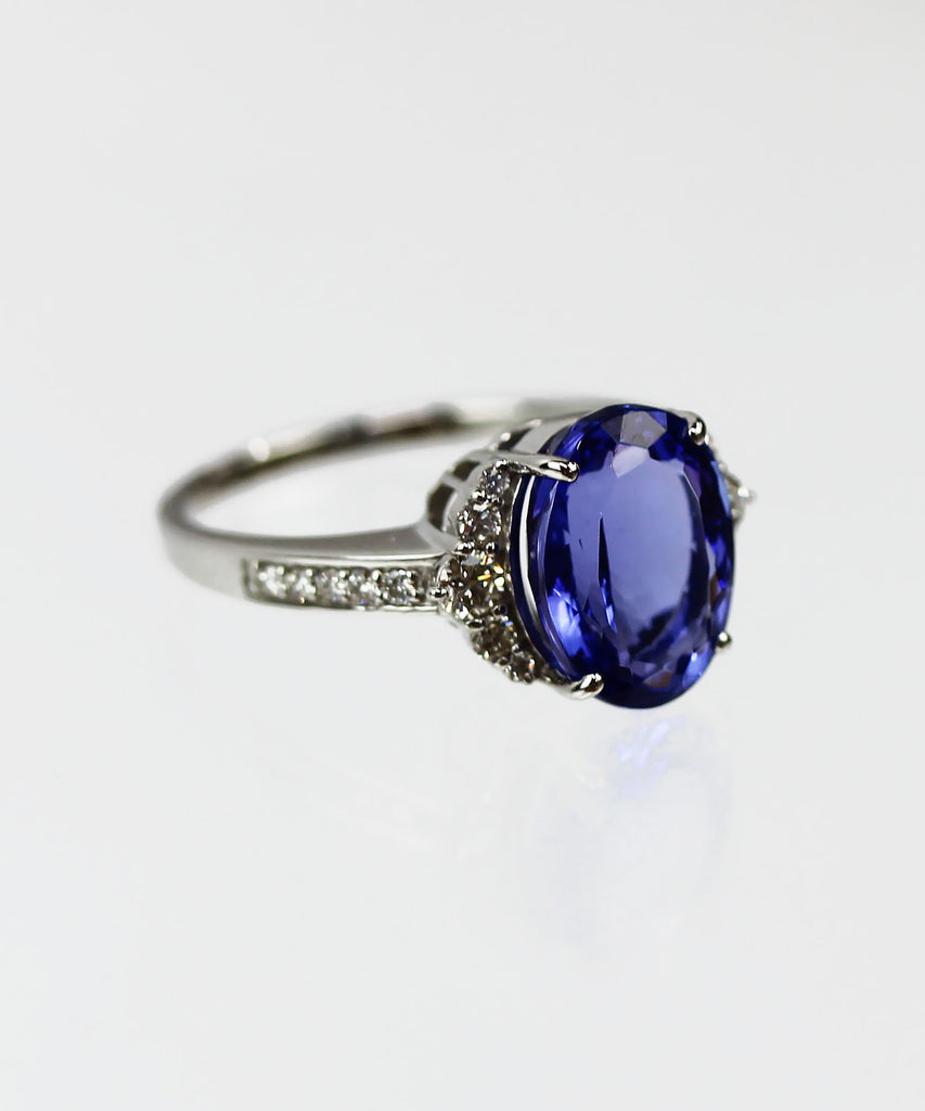 タンザナイトは落ち着きのある青い輝きで、見る角度や光の具合によって見え方が変わる多色性も持ち併せています。